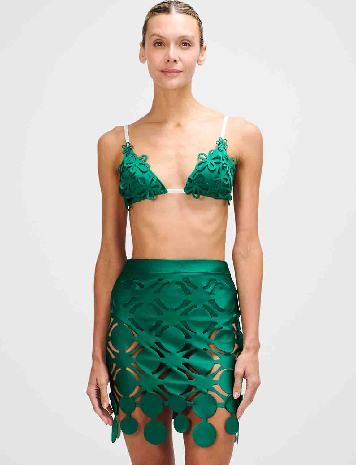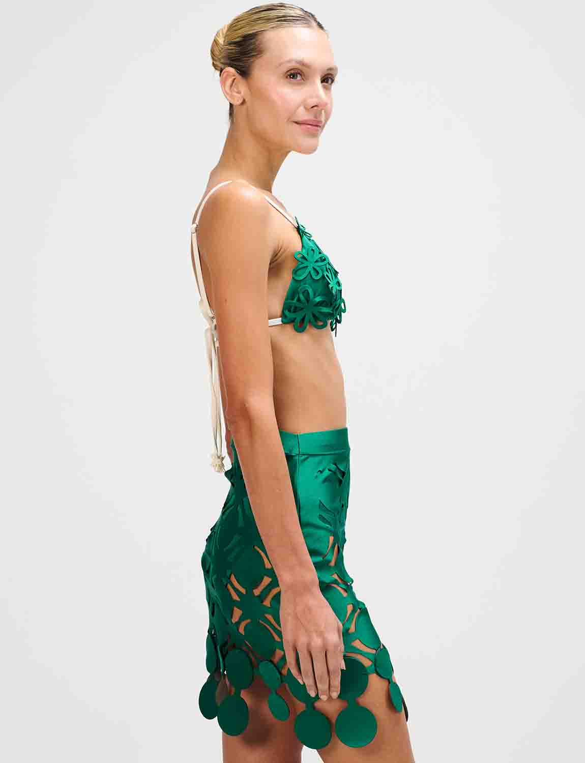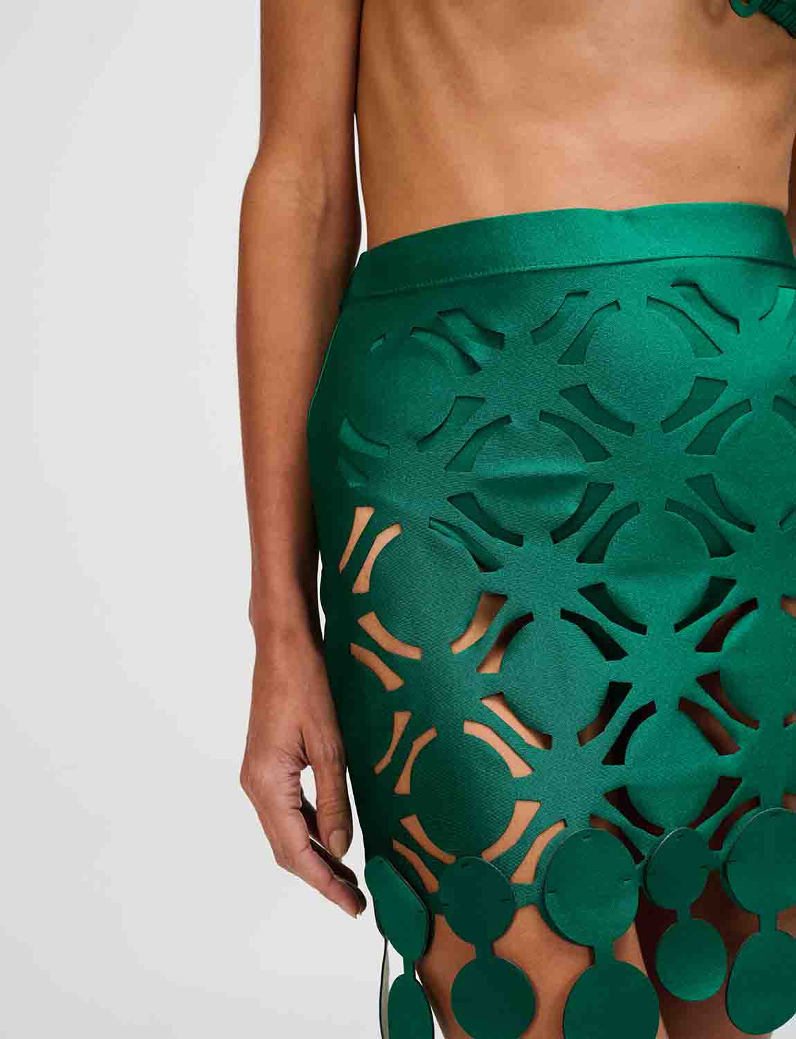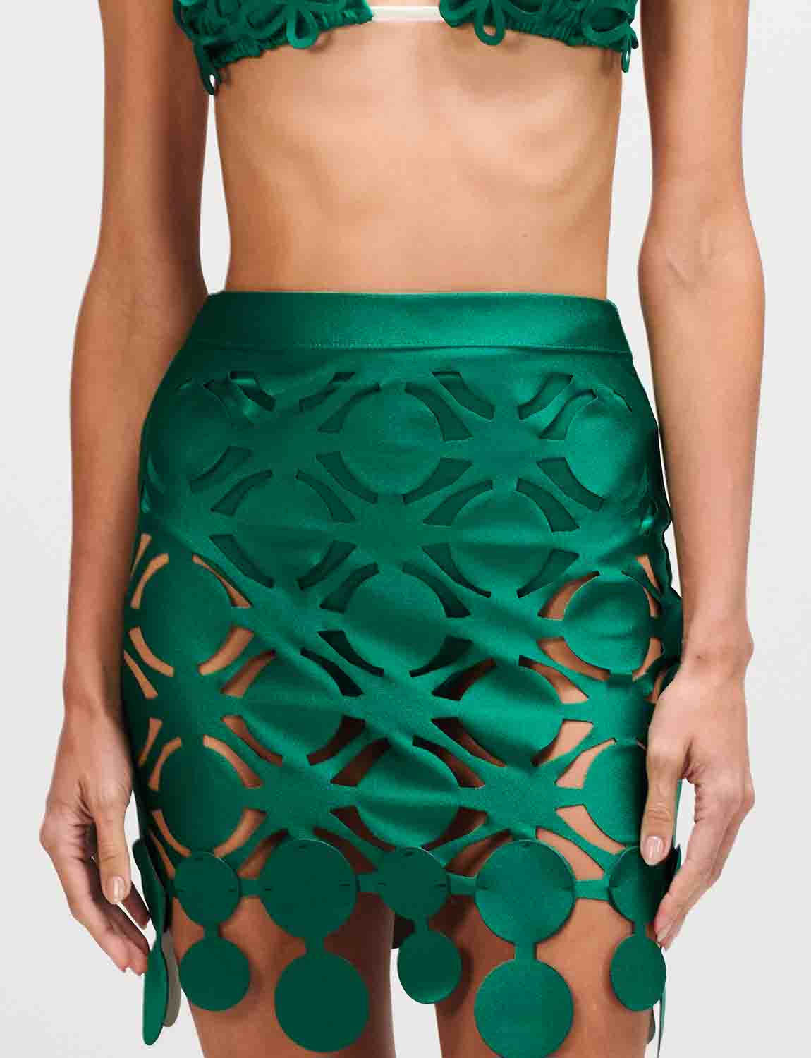 Falda corta con diseño exclusivo y creativo en corte láser, con pretina con elastico.