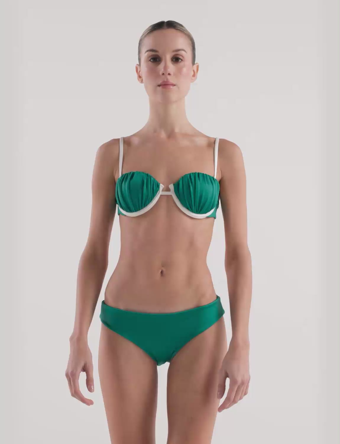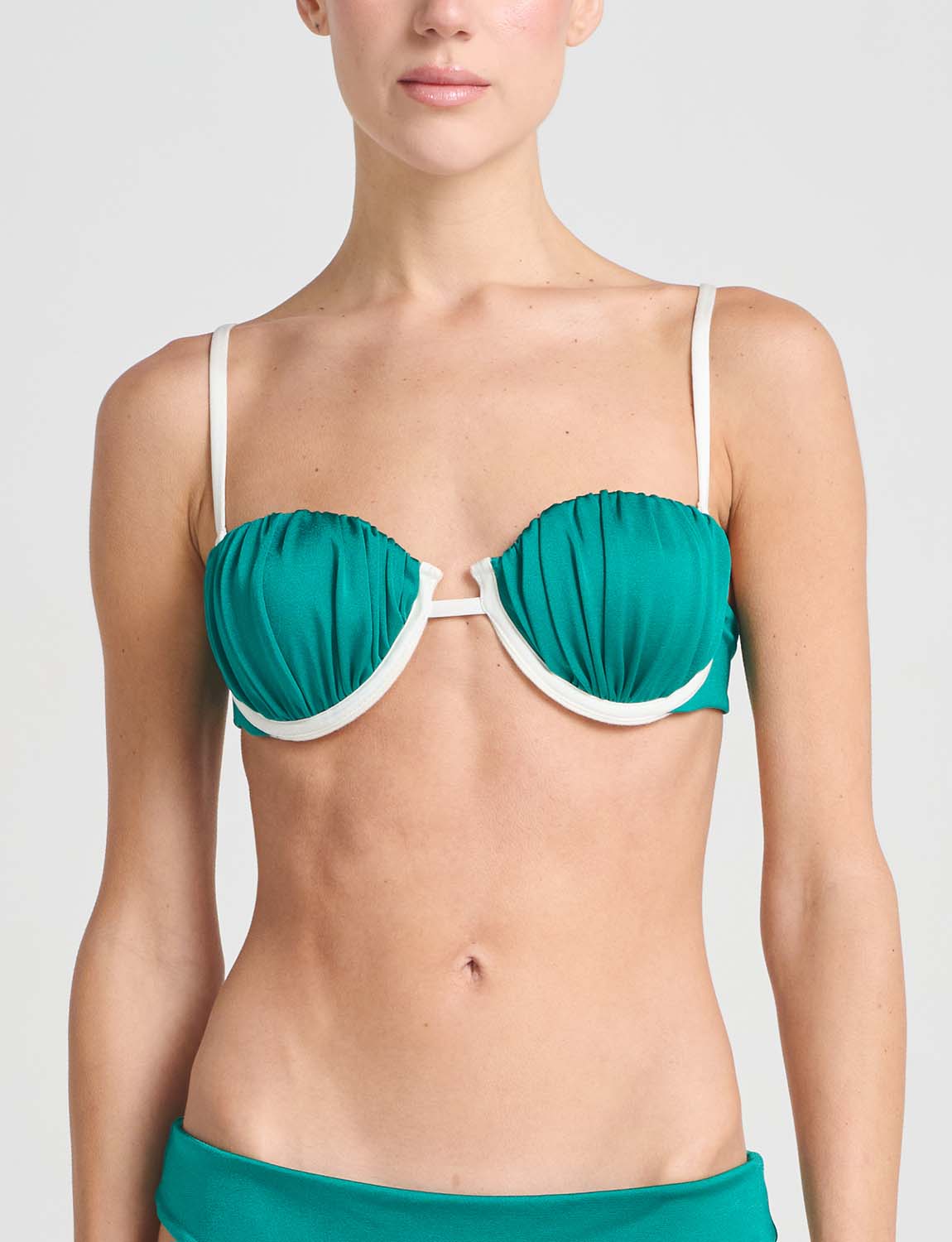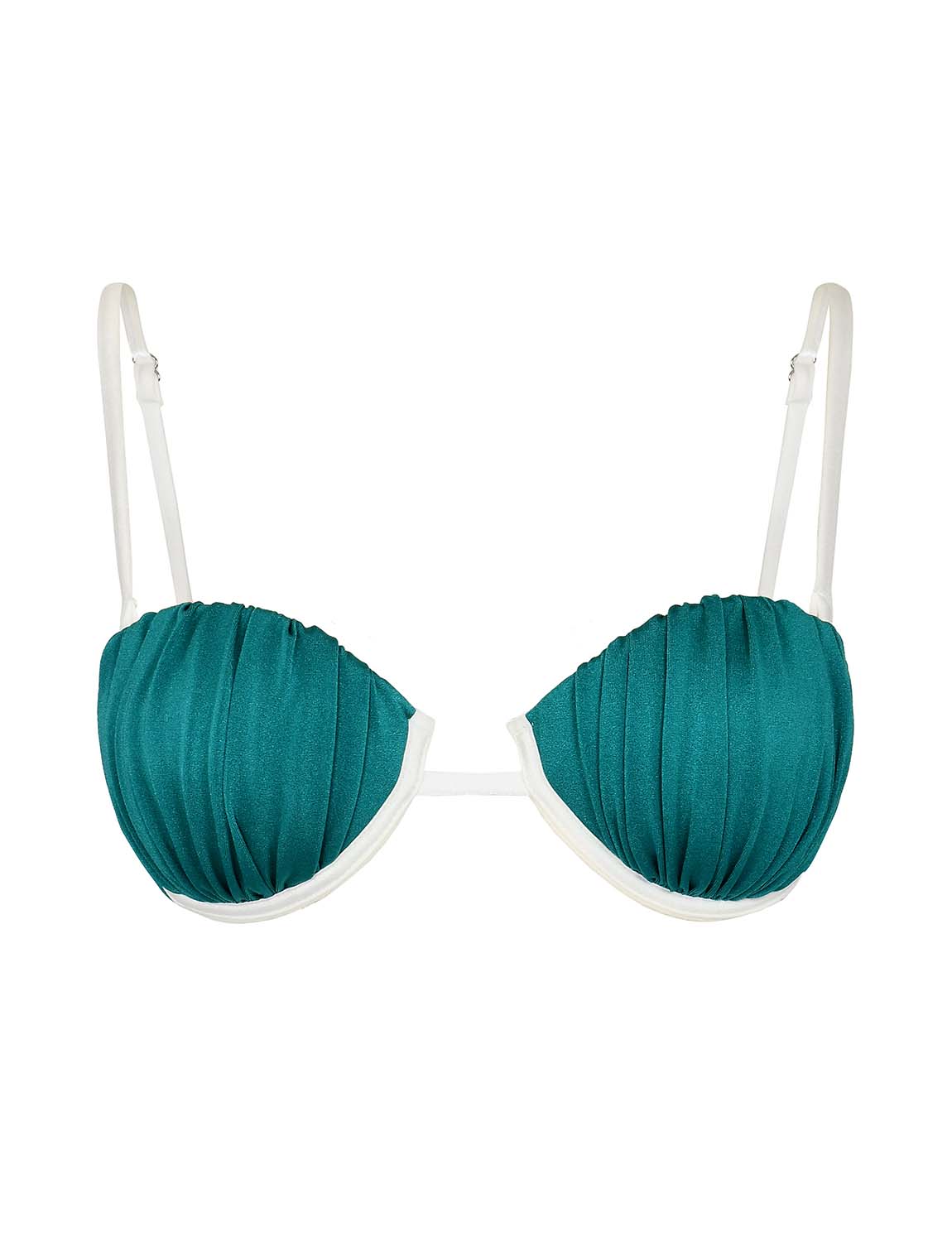 Top de copa fija con la silueta icónica de Ancora y copas drapeadas, diseñado para realzar y definir la figura. Incluye tirantes ajustables con tensores bañados en oro y espalda graduable.