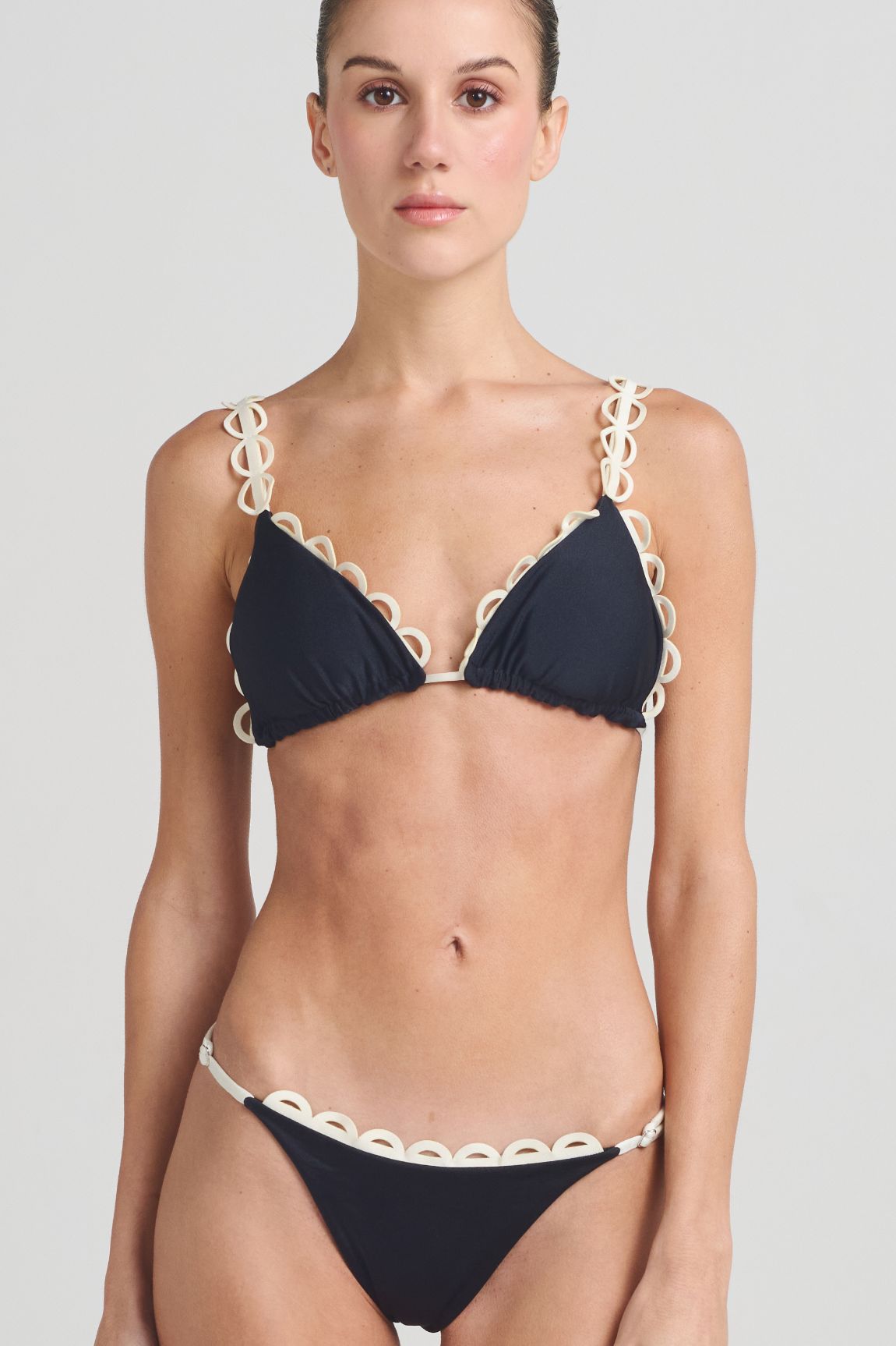 Bottom con tensores graduables en los costados con acabado en baño de oro. Detalles decorativos laminados con diseño en corte láser, cosidos uno a uno sobre la parte superior, y fruncido en la parte posterior.