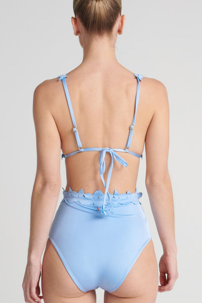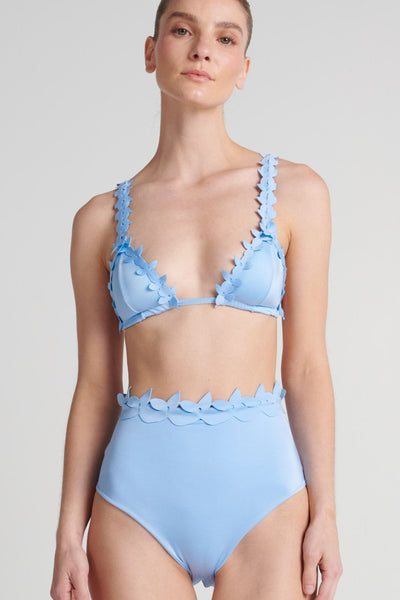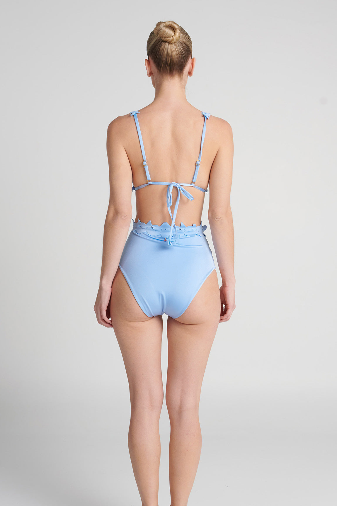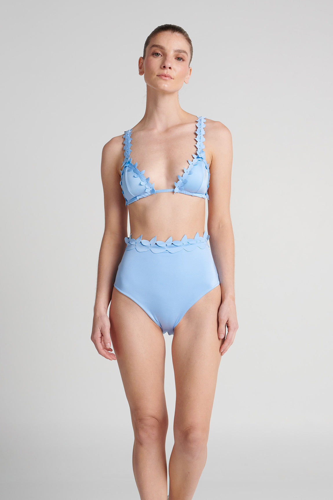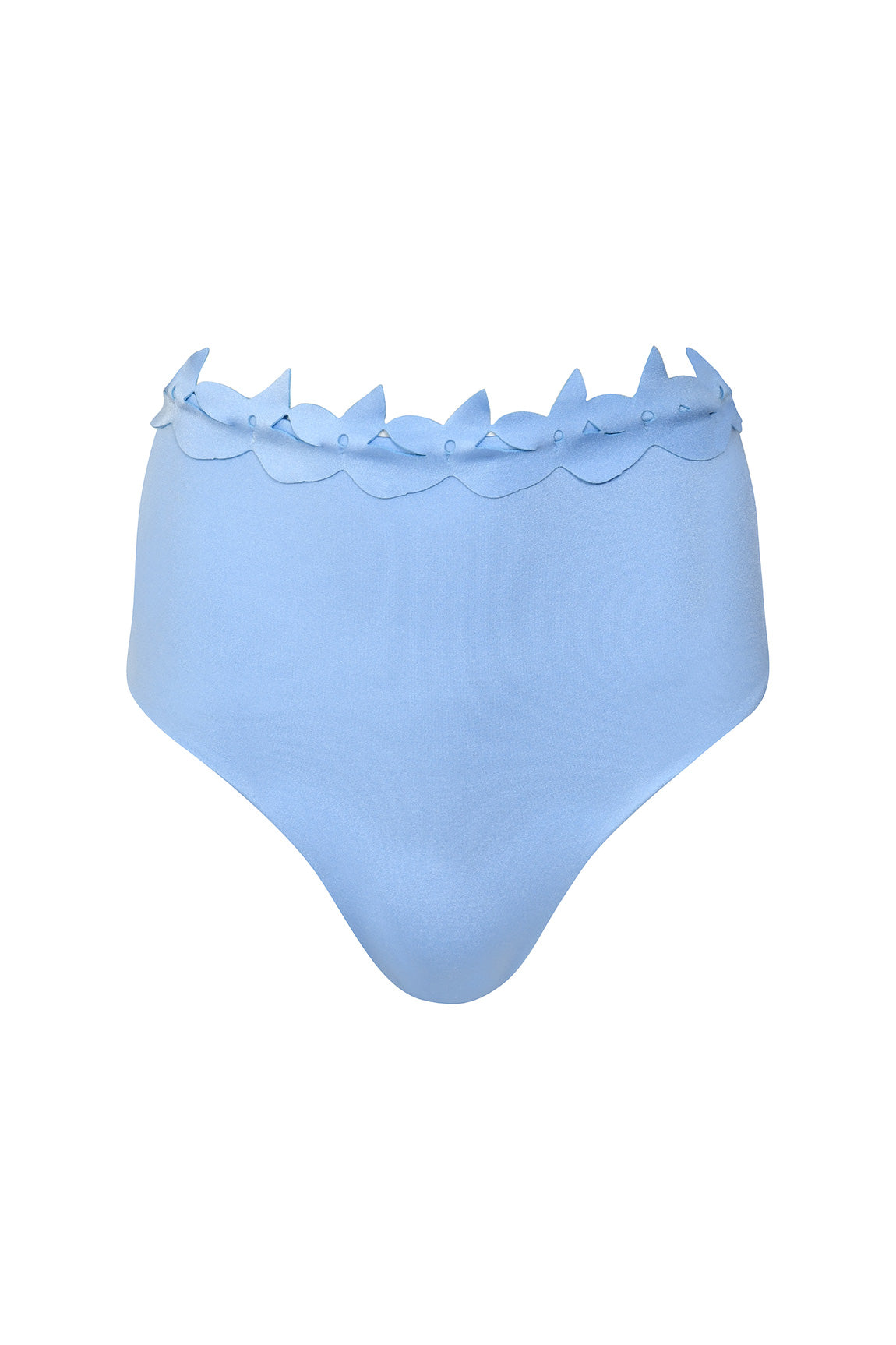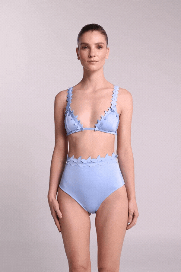 Bottom alto a la cintura. Su confección pasa por un proceso de laminado seguido de corte láser, con detalles adheridos cuidadosamente uno a uno para garantizar un acabado impecable.