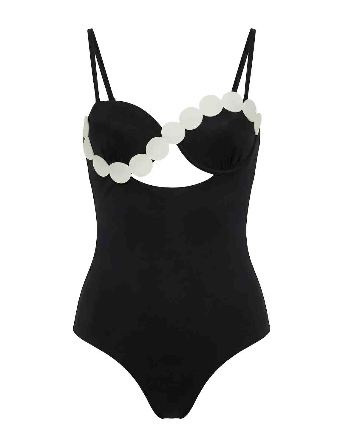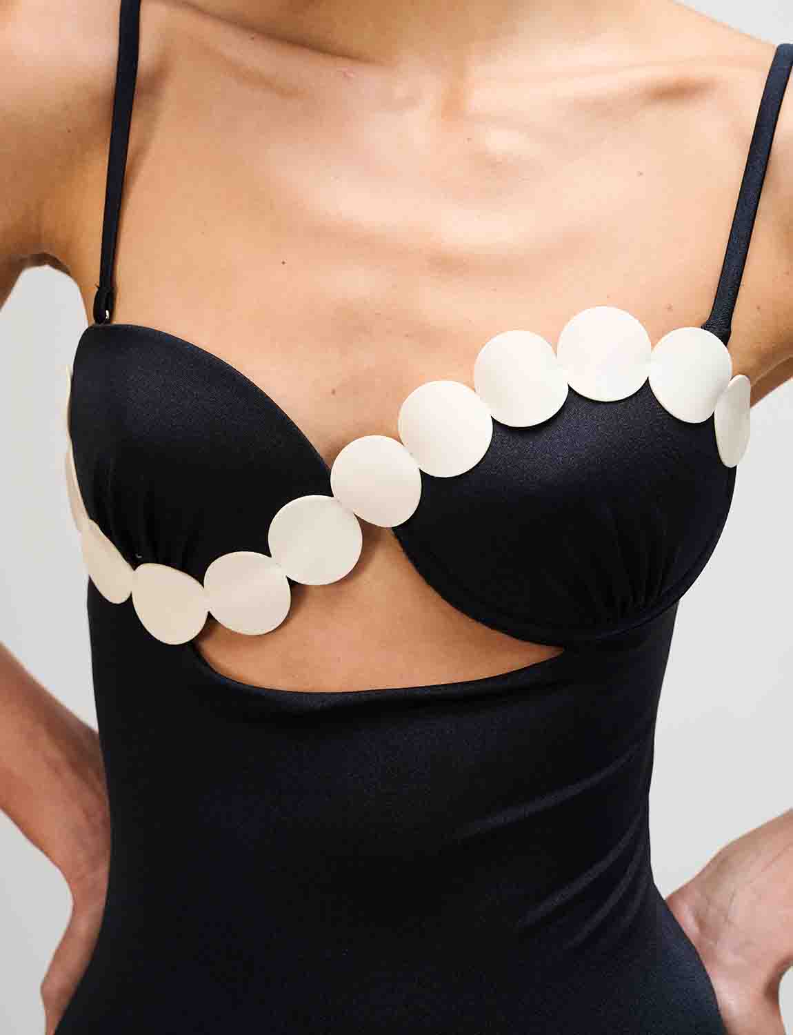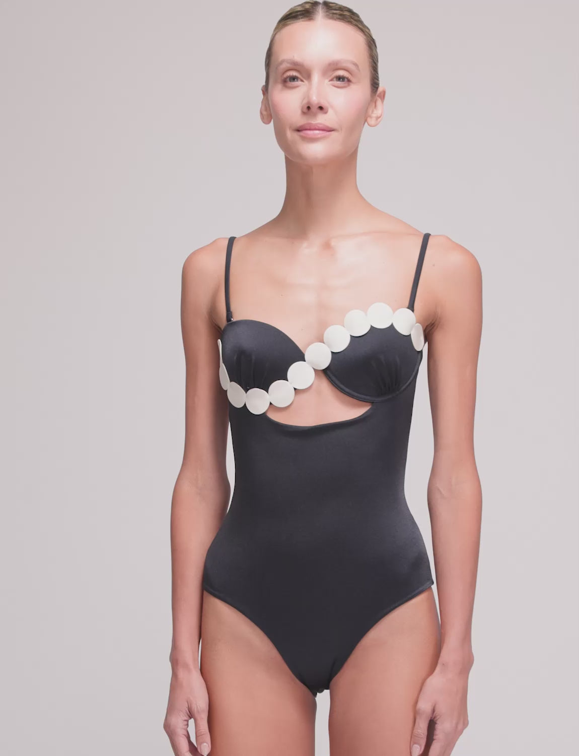 Enterizo con copa fija y la silueta icónica de ANCORA, confeccionado en tela satinada con detalles en corte láser aplicados sobre las copas. Cuenta con tirantes ajustables y removibles para un ajuste personalizado.